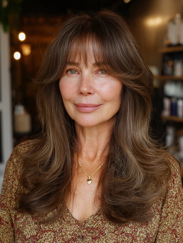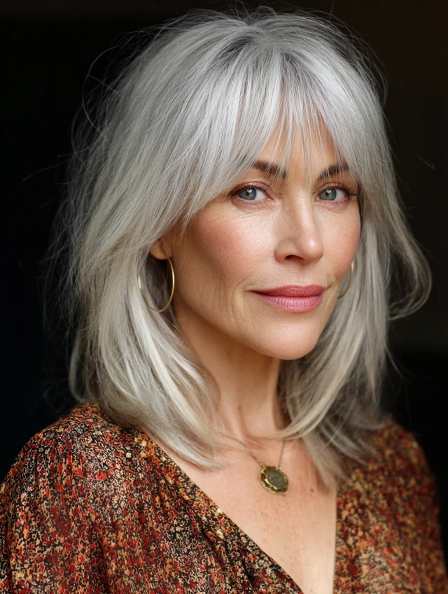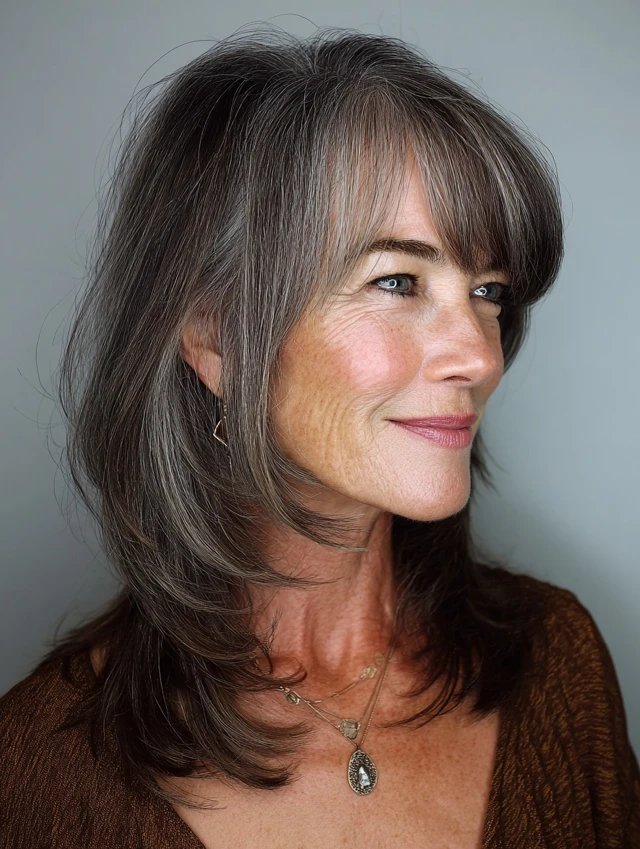 With curtain bangs, mature hair looks modern, soft, and elegant.