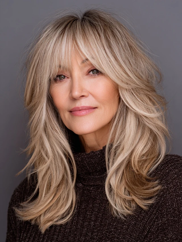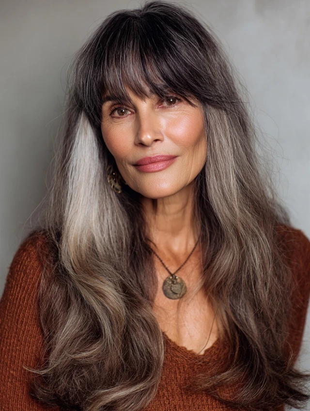 Long hair with bangs softens features and adds dimension.